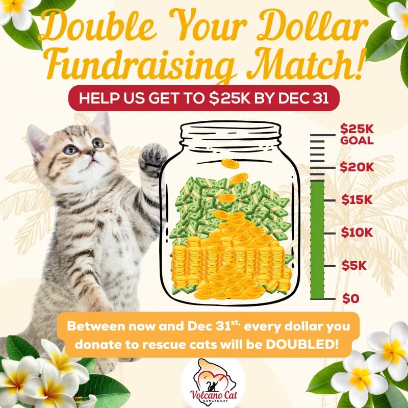 Can you help us turn $25,000 into $50,000? Every single dollar you donate will be DOUBLED! This $50,000 will help us in our second stage of building our permanent sanctuary site. This new sanctuary location will radically increase our capacity to help the kitties and communities of the Big Island. Help us get to $25K by donating today! We also accept checks.
